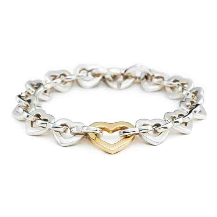 This Tiffany bracelet is made of solid .925 sterling silver and features a gold-plated heart centerpiece for that romantic touch. The entire bracelet measures 7 1/4 inches in length. It also has an interlocking clasp to ensure proper closure. So stay original and elegant while spending less. Perfect to wear every day or on special occasions. Matching necklace also available.